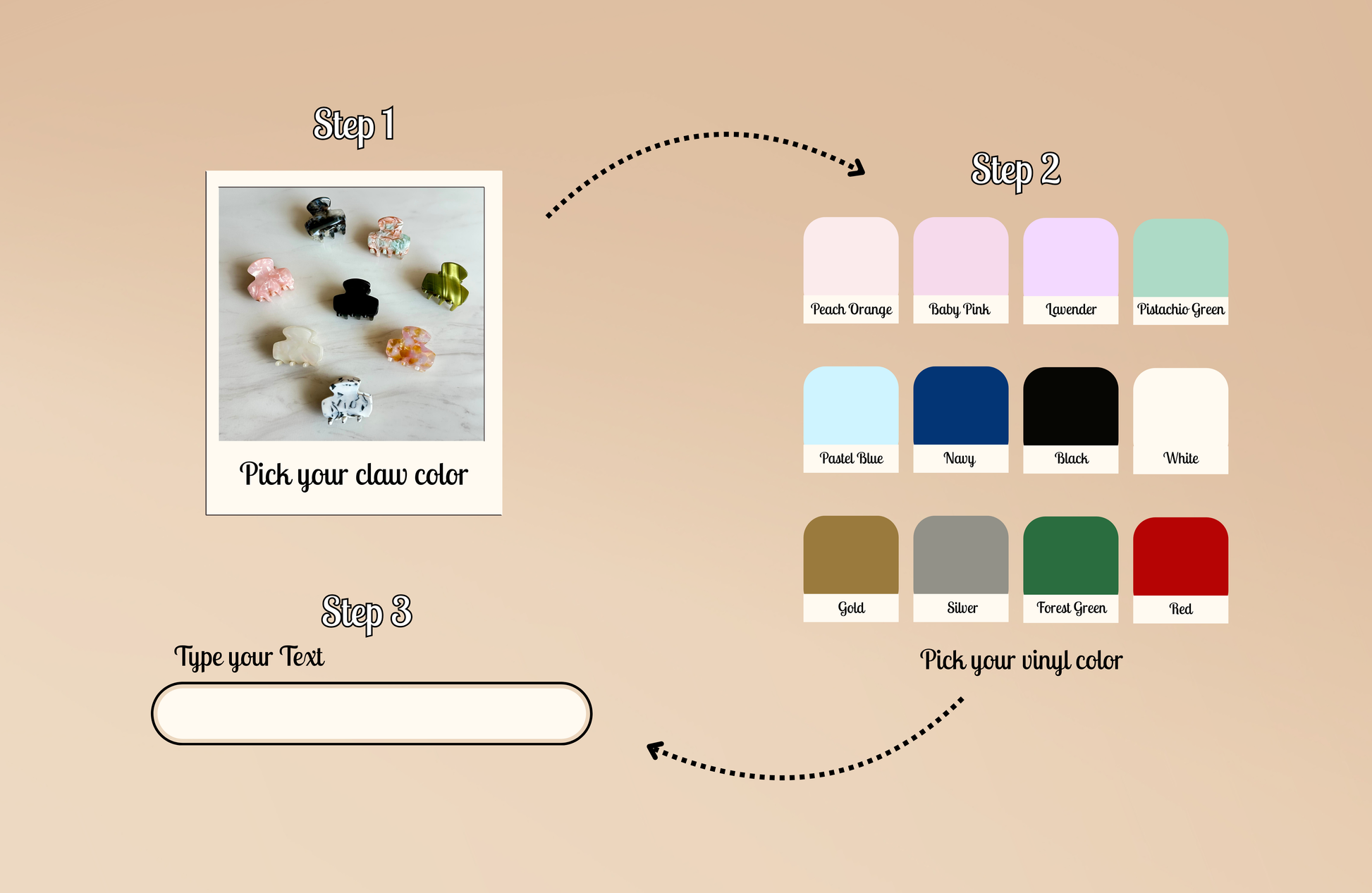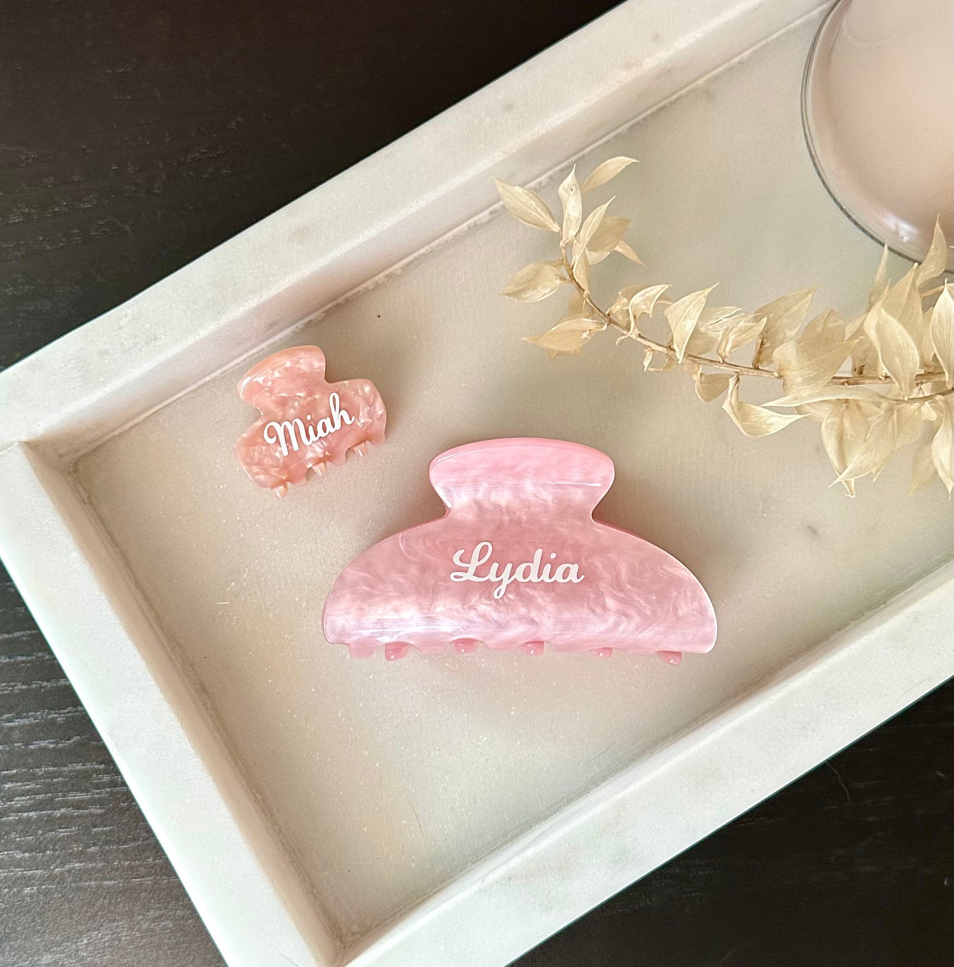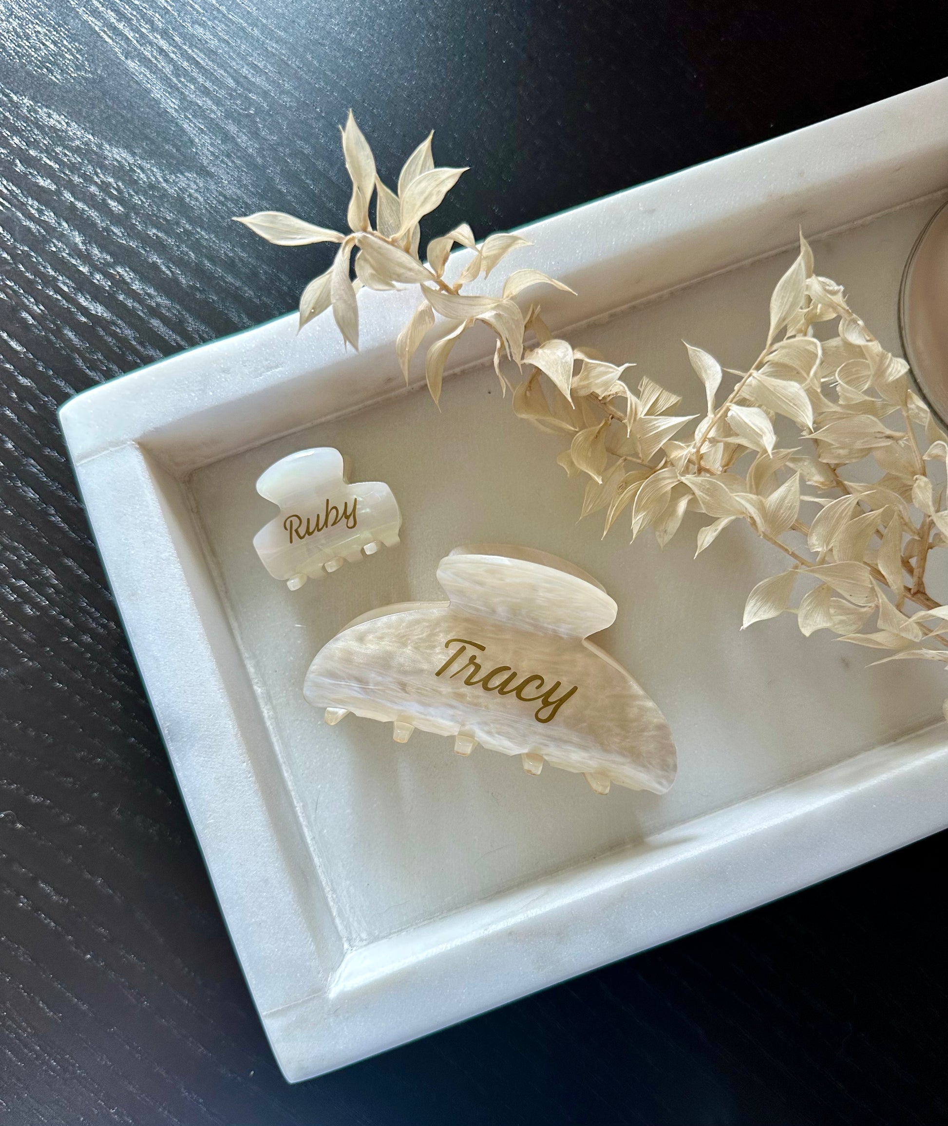 Perfect for little girls, short hair, or simply pulling back a few strands, this mini claw adds a subtle personalized touch to any look. Crafted in a beautiful marble effect, each clip is customized with your choice of name or initials using premium vinyl.
